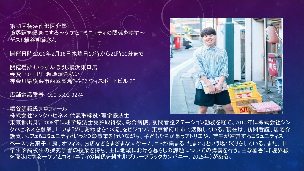 内容としては、学びの時間(講師のお話を聞いたり、ちょっとしたゲームみたいなこと)を行った後、共通の学びを通して、対話が弾むように懇親会を開催したいと考えております。戸塚駅周辺での開催を中心に考えていますが、内容によって横浜駅での開催も考えております。